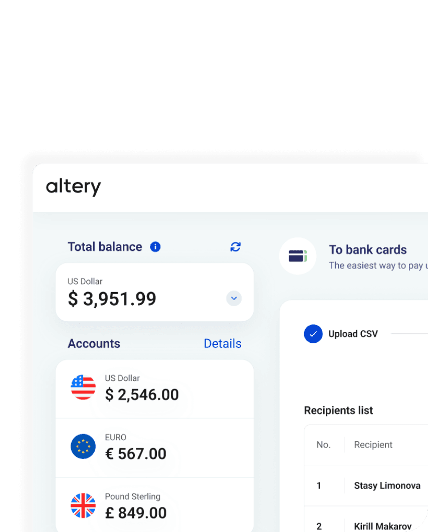 Automate payments, mass payouts, card issuance, balance checks, and transaction reporting. Integrate with your systems.