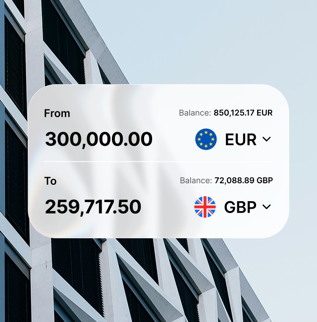 Hold GBP, EUR and USD in dedicated wallets, watch live rates and convert instantly between currencies.