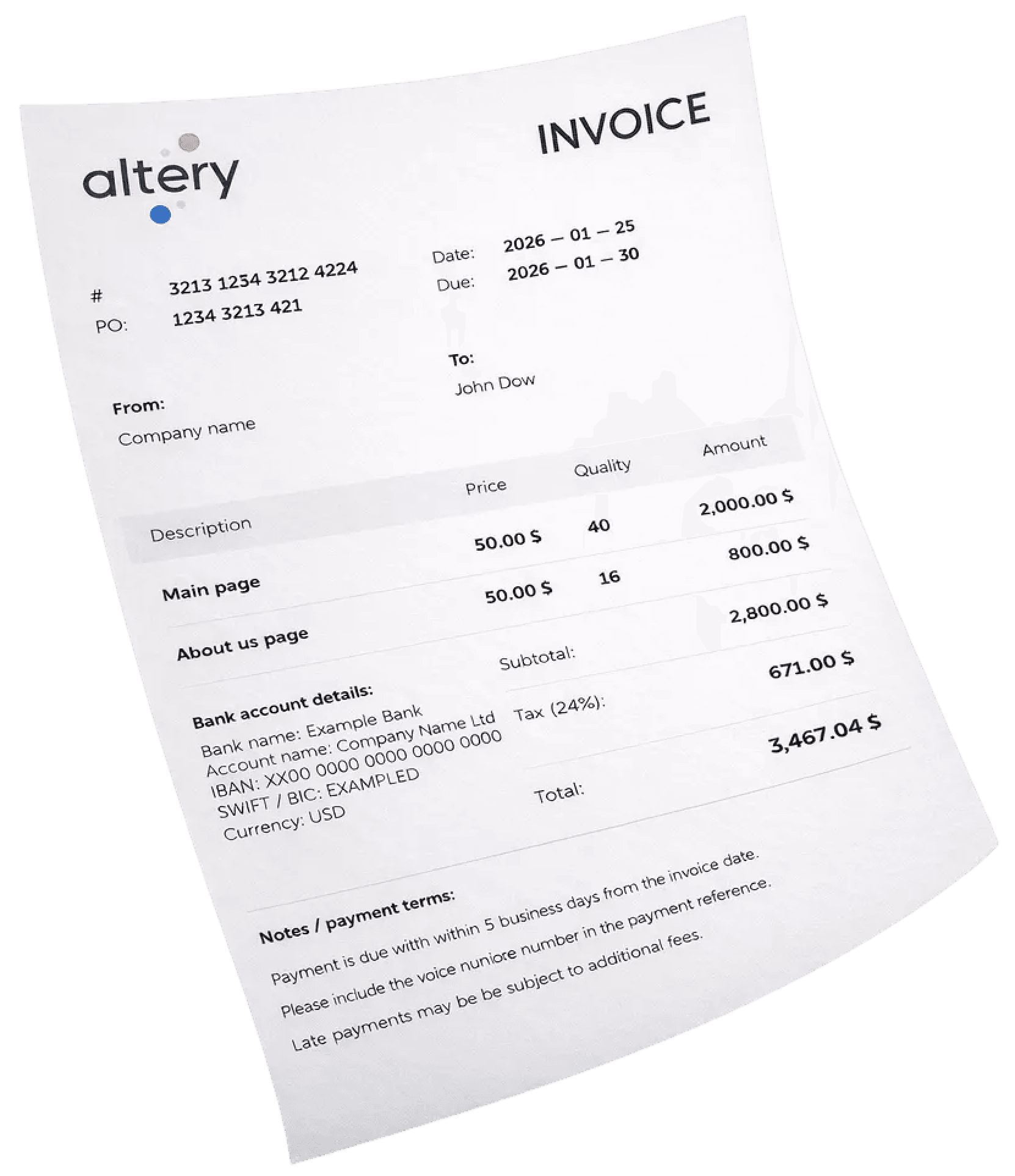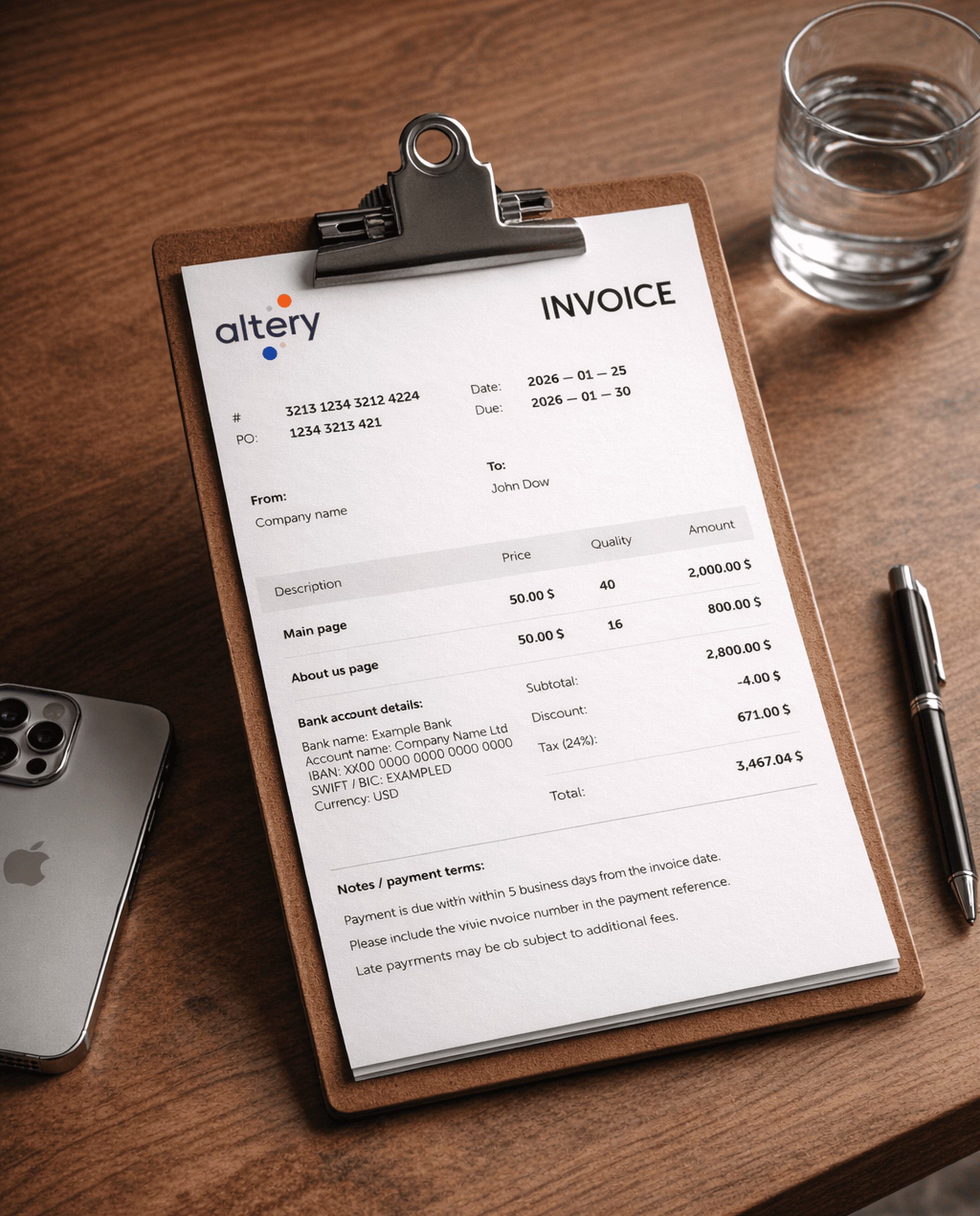 Dedicated sections for Payment terms and Payment methods (e.g., "Bank Transfer to [Account]" or "PayPal Link").