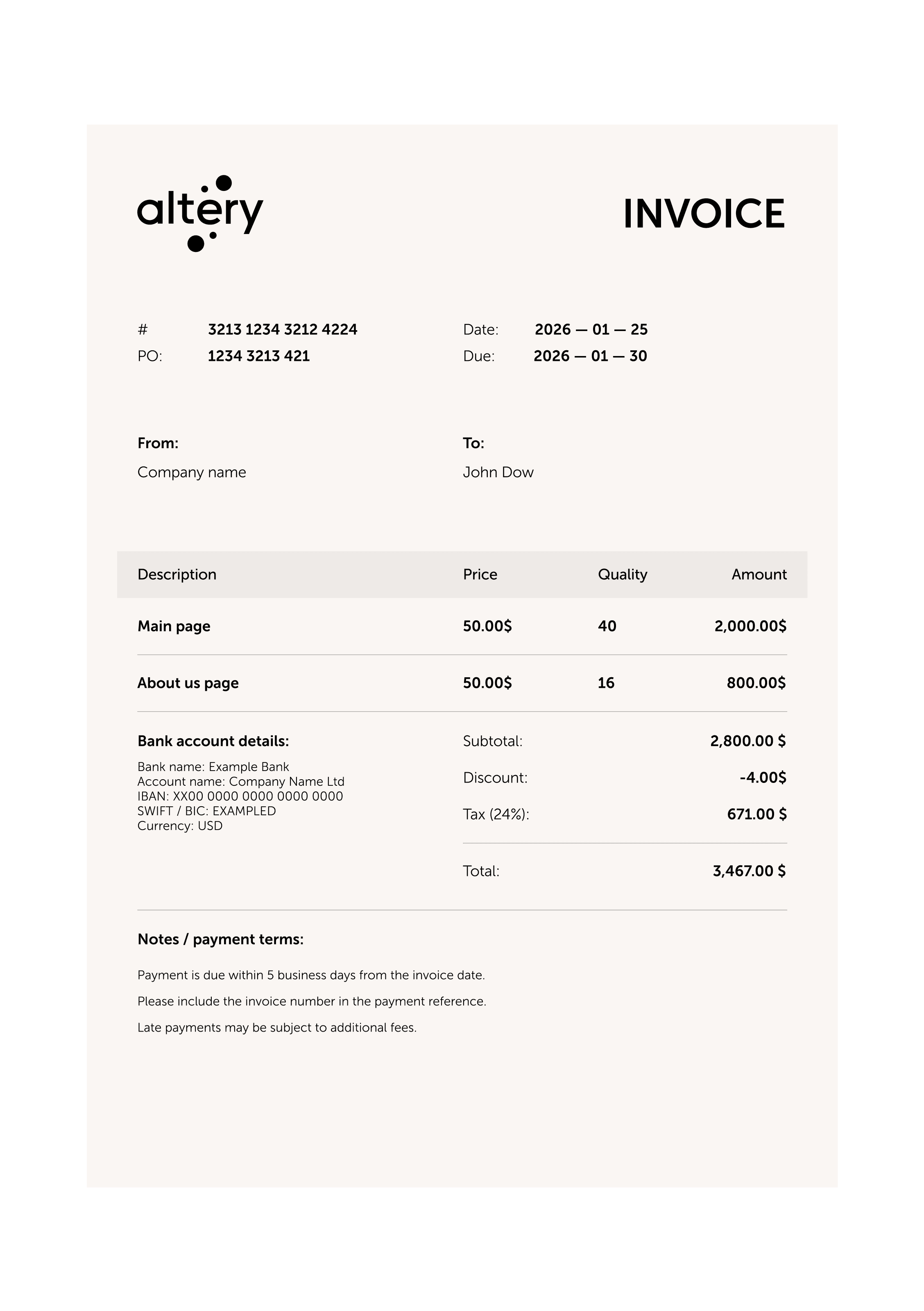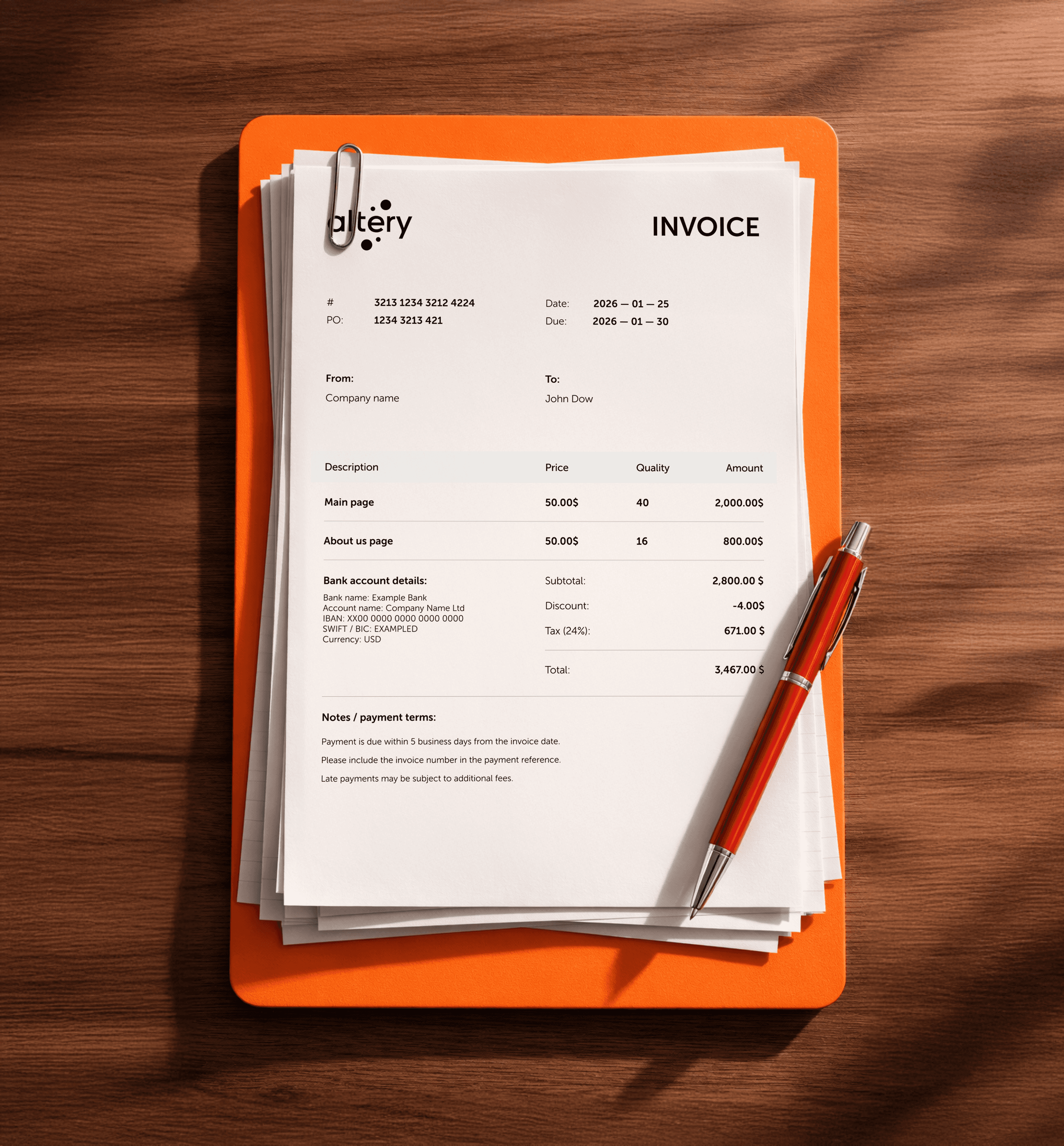 Specifics on payment due dates and methods (e.g., Net 30).
